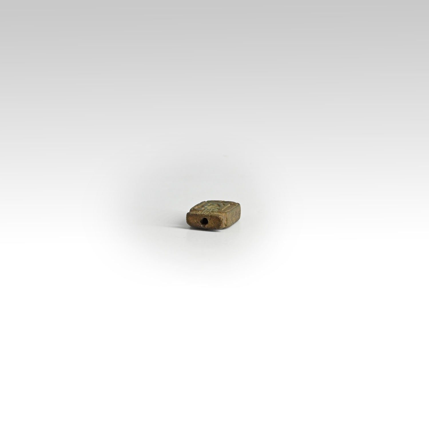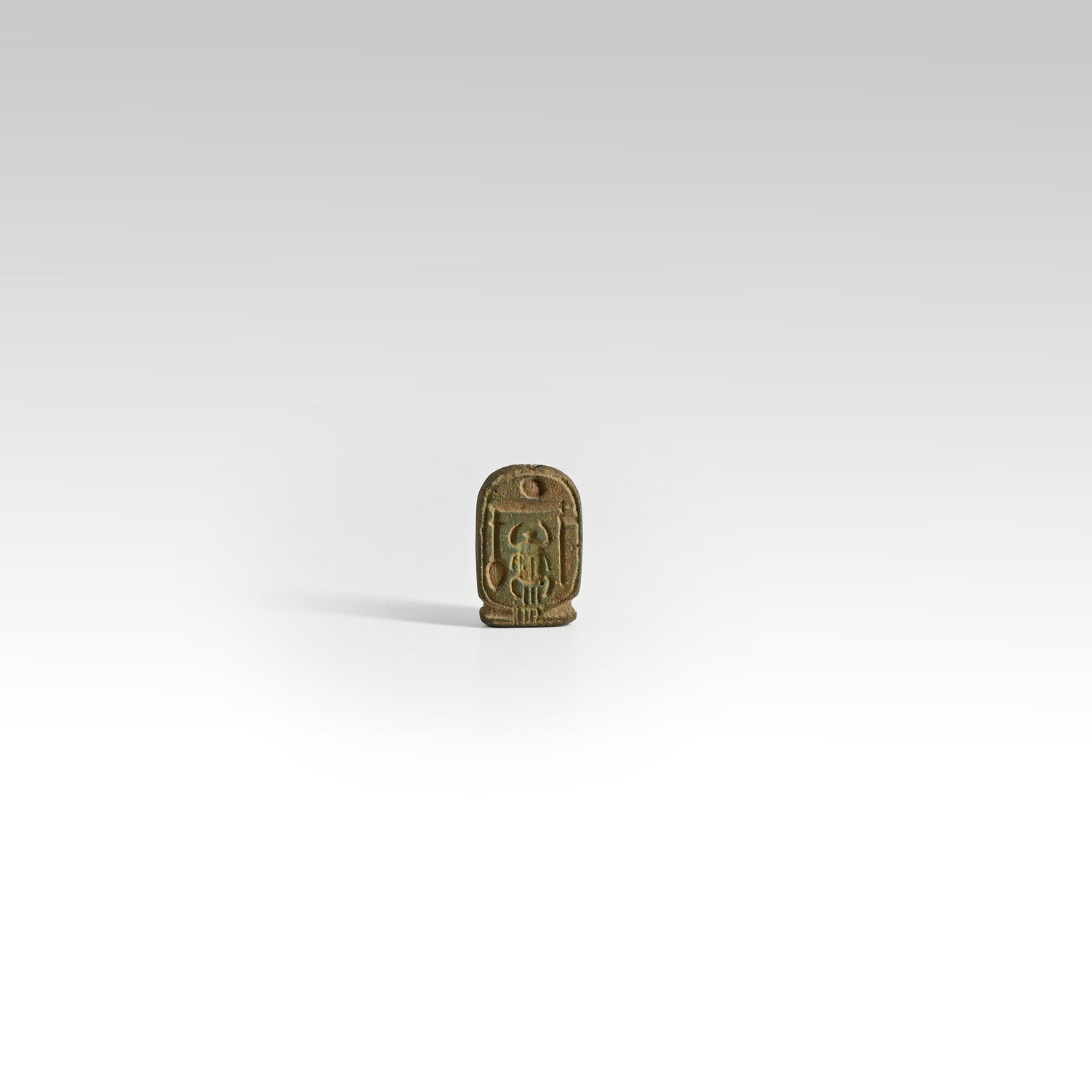 A rare double-sided faience plaque in the form of a cartouche, glazed in green-brown tones with traces of surface patina. One side bears the prenomen (throne name) of Pharaoh Amenhotep II, ˁꜥ-ḫprw-Rˁ (Aa-kheperu-Re, “Great are the manifestations of Re”), while the reverse carries his nomen (birth name), Jmn-ḥtp (Amenhotep, “Amun is satisfied”). The combination of both cartouches on a single amulet is an unusual feature that emphasizes its royal and devotional character.
