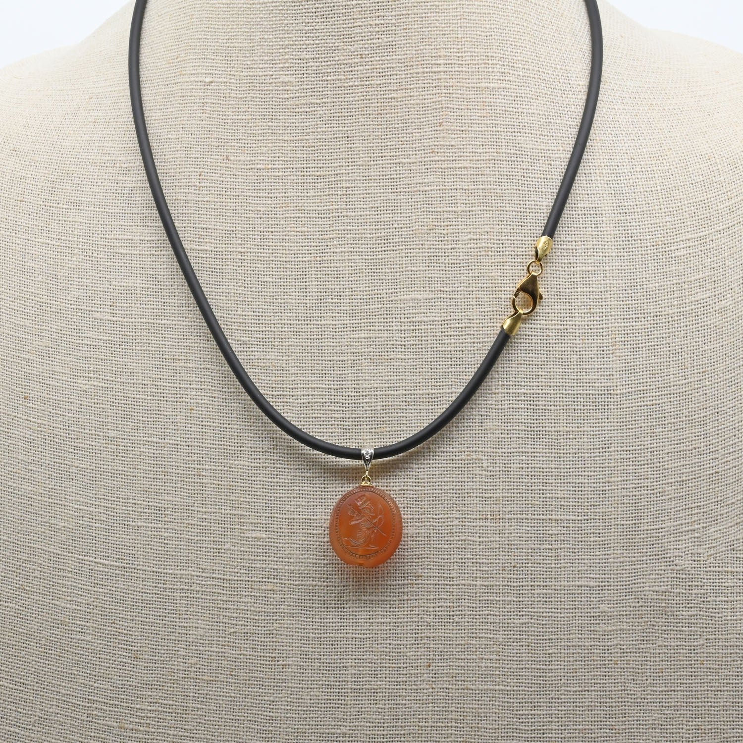 Condition: Intact and in excellent condition; fine polish with sharp carving and original suspension hole drilled laterally. A lovely example. It has been modern set as a pendant, with a 14-karat yellow gold tapered bail adorned with a round 0.02 ct diamond (I1 clarity, G–H color), and suspended from a modern black leather cord with 14K gold fittings and clasp.