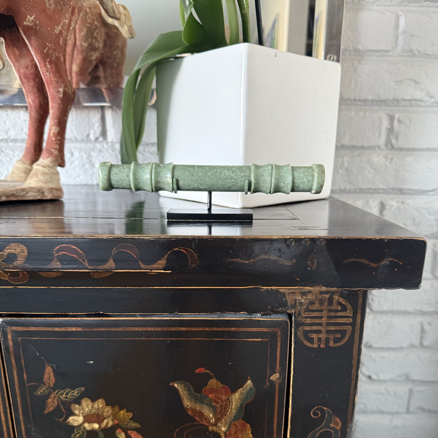 The process of carving jade posed a formidable challenge due to its exceptional hardness. Without the aid of metal tools, the Maya ingeniously employed techniques such as pecking, sawing with abrasive sand and cord, and grinding with hard stones or sand. Each piece could take weeks, months, or even years to complete, requiring tremendous time, patience, and skill. This remarkable process underscores the labor-intensive effort that went into creating such an exquisite work of art. As a bead of this scale required exceptional raw materials and significant labor to produce, the impressive size and sculptural detail of this example strongly suggest that it likely belonged to a person of high status, such as a noble or a member of royalty.