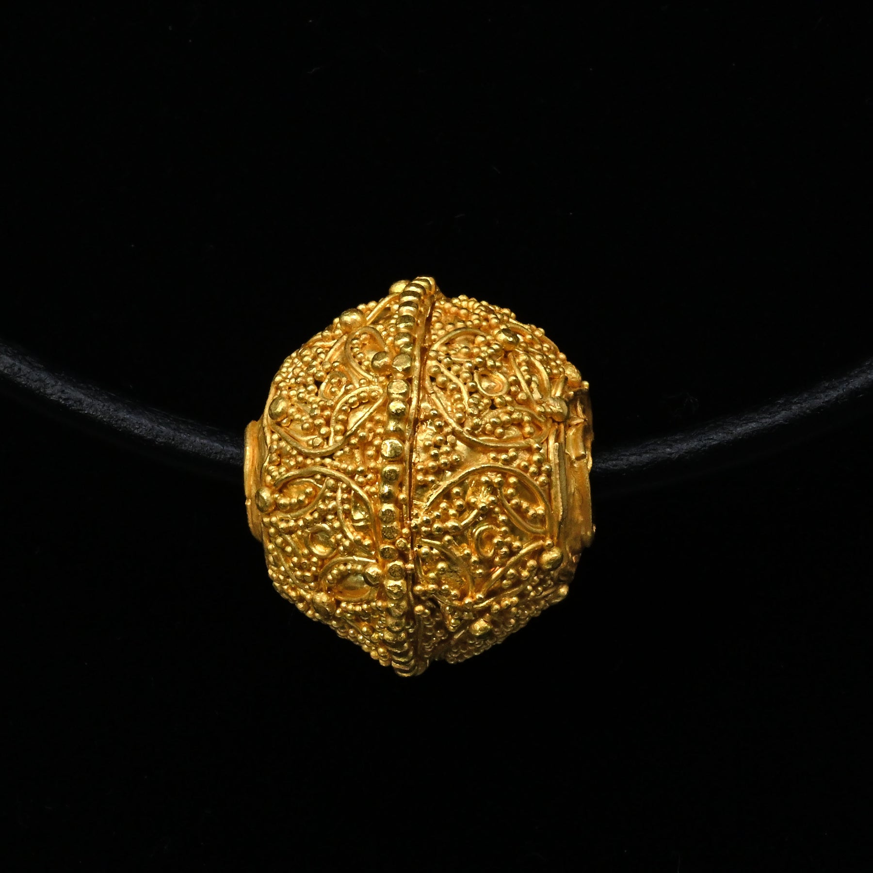 Condition: The bead is intact and in excellent condition overall. The granulation and filigree remain sharply defined, with only minor age-appropriate softening to a few granules. No significant losses or restorations observed. It has been modern strung on a 24K gold chain of ancient design. An exceptional piece.