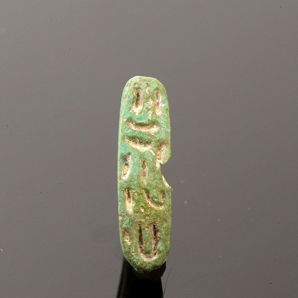 A green faience stirrup ring with hieroglyphic inscription inscribed into the bezel.