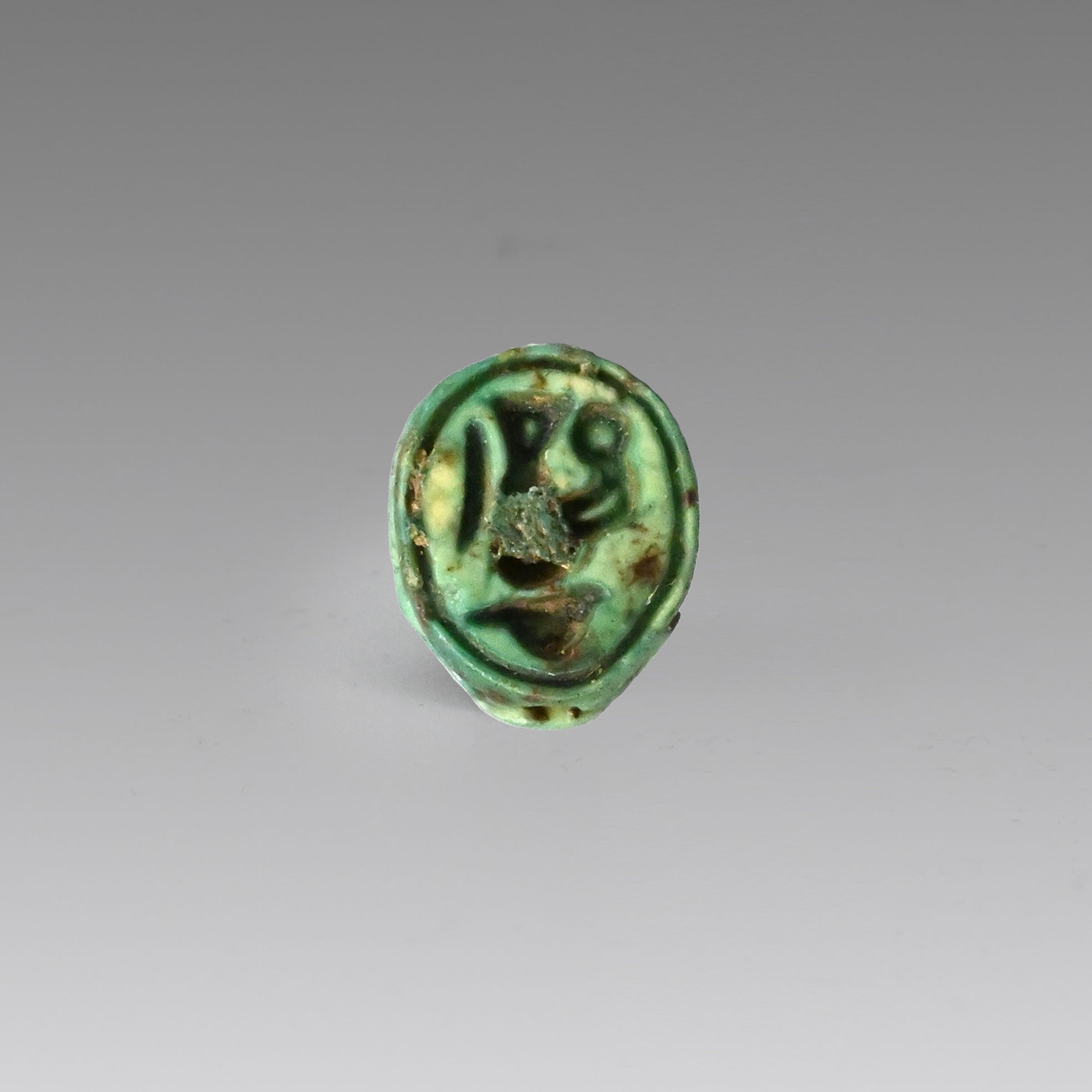 A particularly finely worked green glazed composition amulet representing the god Pataikos, the bandy-legged dwarf shown naked with large janus head, both faces with finely drawn brows, defined eyes with pronounced cosmetic lines, and a cheerful smile. Shown with his hands resting on either side of his protruding midriff, an incised suspension loop at the back, the complete composition attests to the delicacy of the craftsmanship.