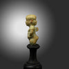 Condition: very well executed with fine and detailed modeling of the body; pale green glaze well preserved; both lower legs and feet missing, loss of one ear, loss of fingers to the right hand, and minor chips to face and body. Custom mounted on original 19th/early 20th-century bobbin mount.