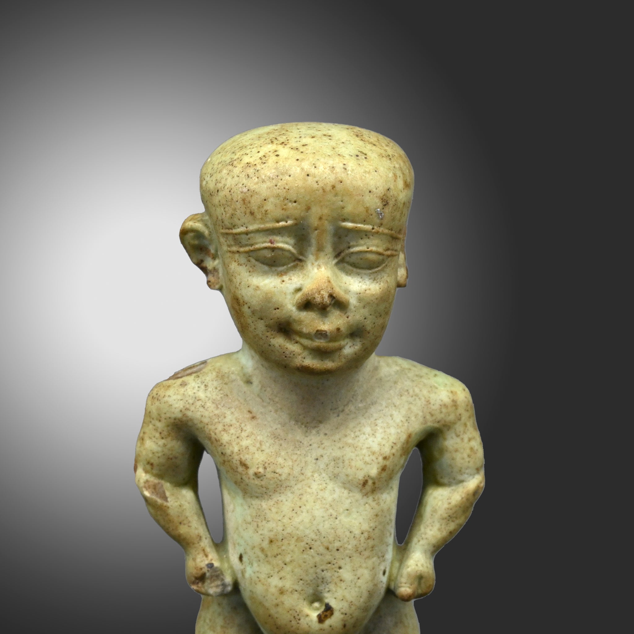 A particularly finely worked green glazed composition amulet representing the god Pataikos, the bandy-legged dwarf shown naked with large janus head, both faces with finely drawn brows, defined eyes with pronounced cosmetic lines, and a cheerful smile. Shown with his hands resting on either side of his protruding midriff, an incised suspension loop at the back, the complete composition attests to the delicacy of the craftsmanship.