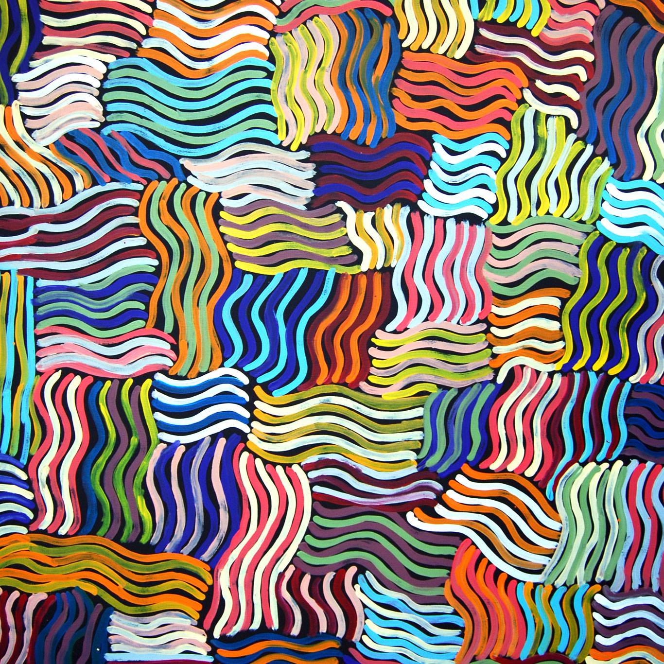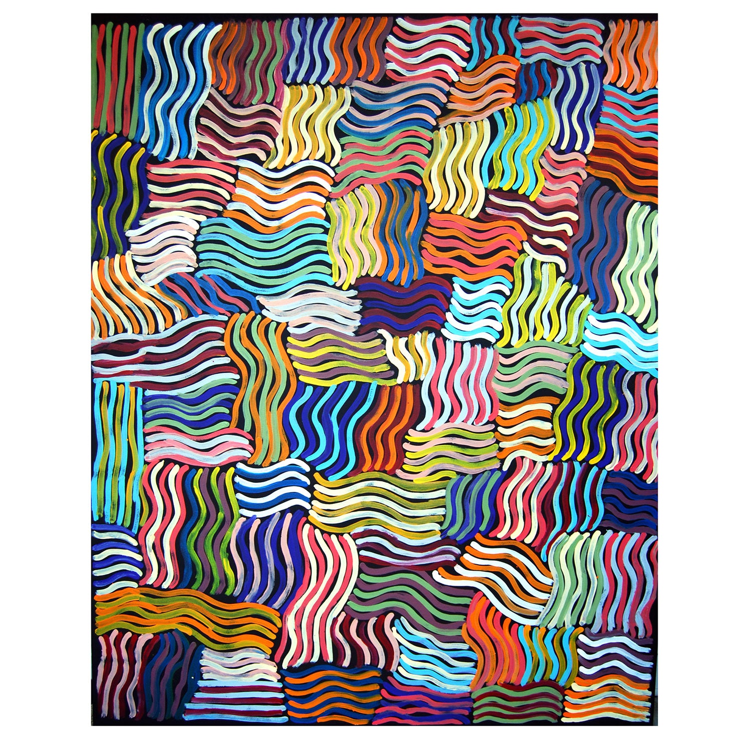 The Awelye-Atnwengerrp paintings such as this superb example, have developed directly from Betty’s experience as a ritual body painter, resembling as they do the patterns and designs used in these ceremonies. These vary depending on their subject and the season, and the seniority of the women. In the ceremonial designs, a variety of powders ground from charcoal and yellow and red ochres are finger-painted on the breasts and upper bodies of the singers and dancers. The paintings show lines of varying lengths and widths, and a variety of colors is used to build up these Dreamings.