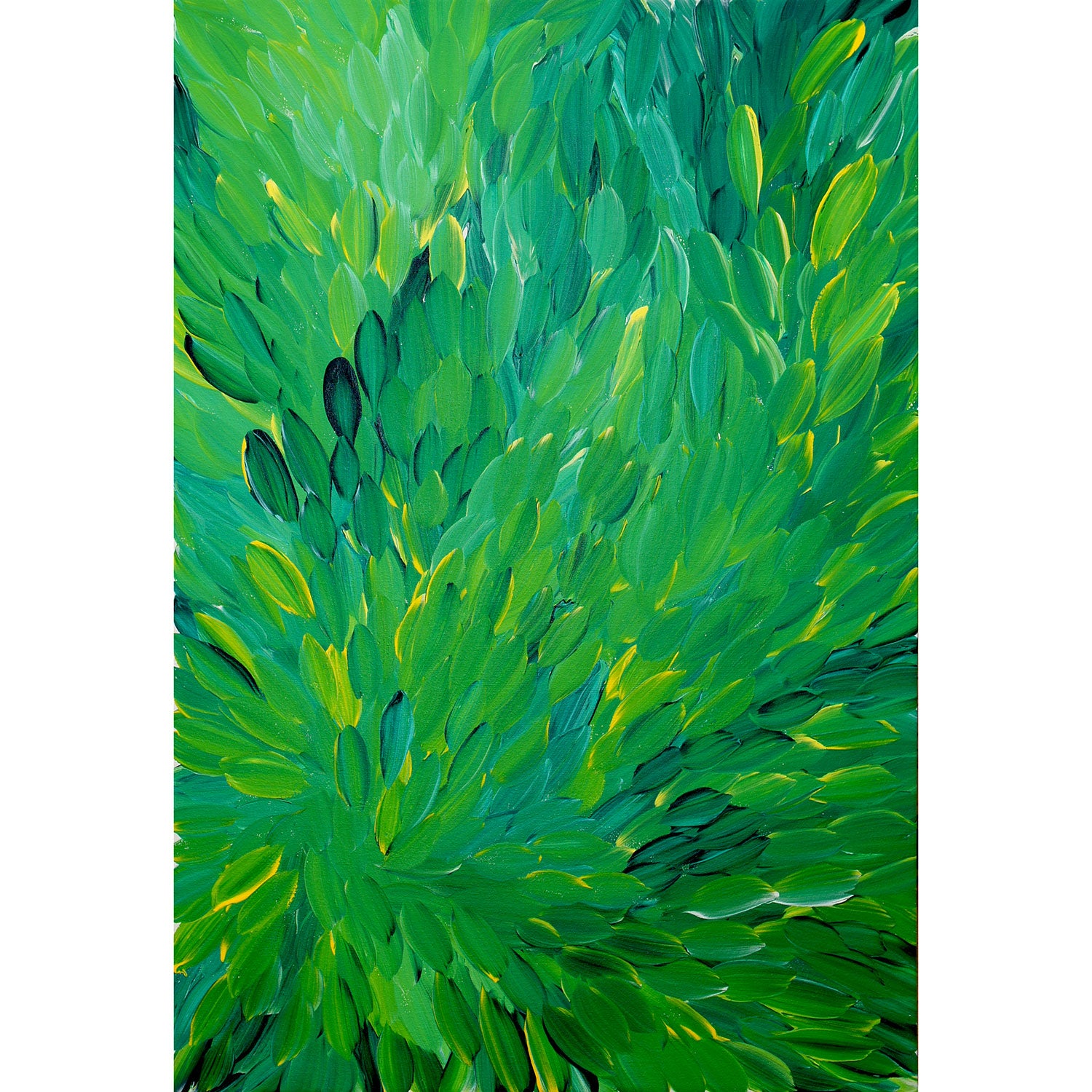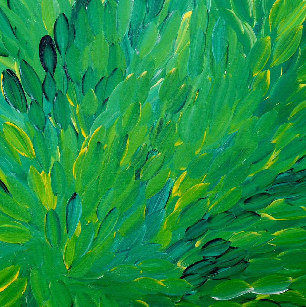 This painting is one of Gloria’s trademark artistic interpretations of her well-known design, the Bush Medicine Dreaming. It features Gloria’s unique style depicting the leaves of the bush medicine plant in broad, vibrant brush strokes with well defined segments filled with curved lines, that evoke a strong rhythmic quality.