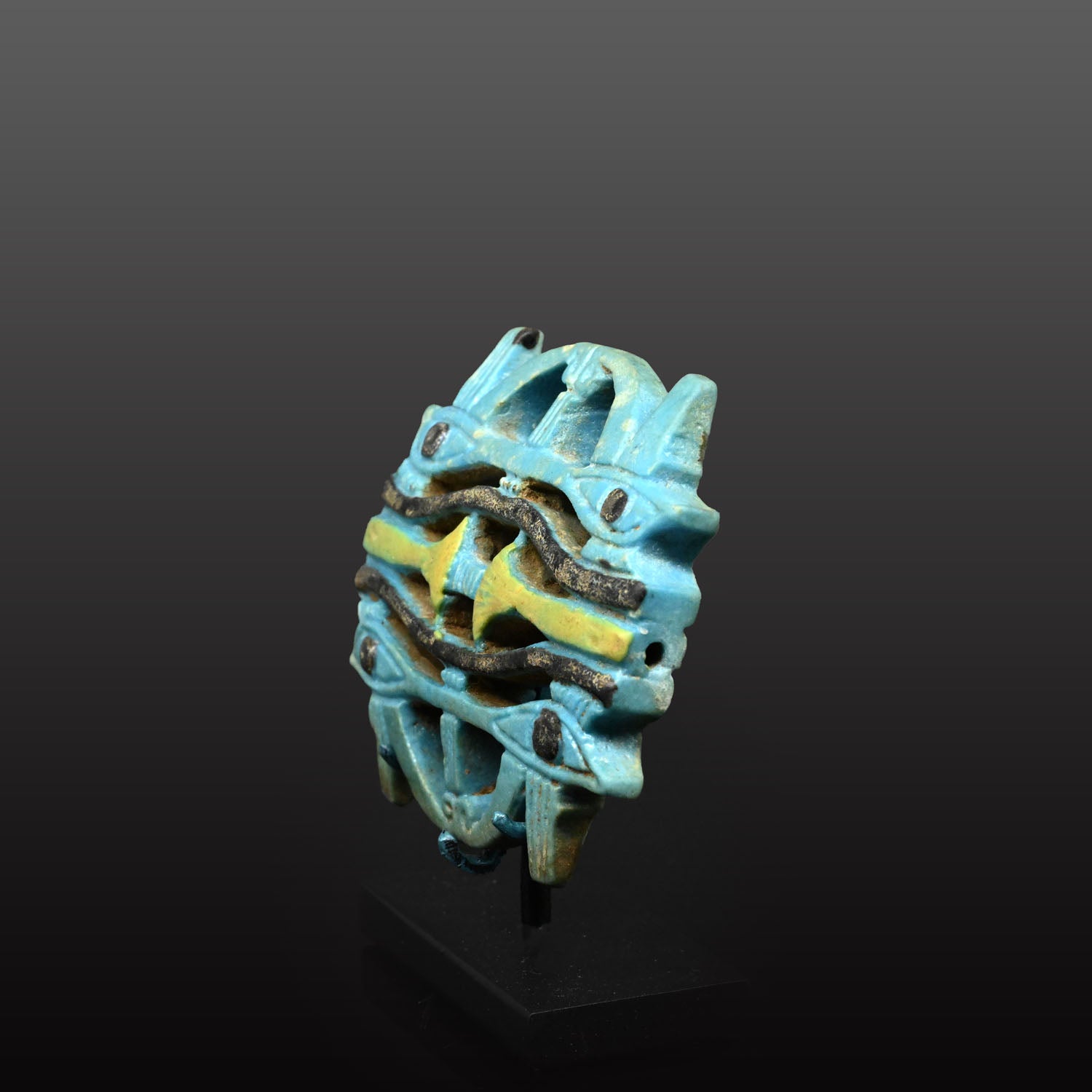 A rare and finely executed faience openwork plaque of rich turquoise, molded in high relief with four wedjat (Eye of Horus) motifs surrounding a central vertical axis of two stacked djed pillars, creating a balanced and visually powerful composition. Embodying the Egyptian themes of protection, endurance, and resurrection, the plaque is pierced longitudinally for suspension, and is executed in brilliant turquoise blue faience with contrasting yellow and black glaze highlights.