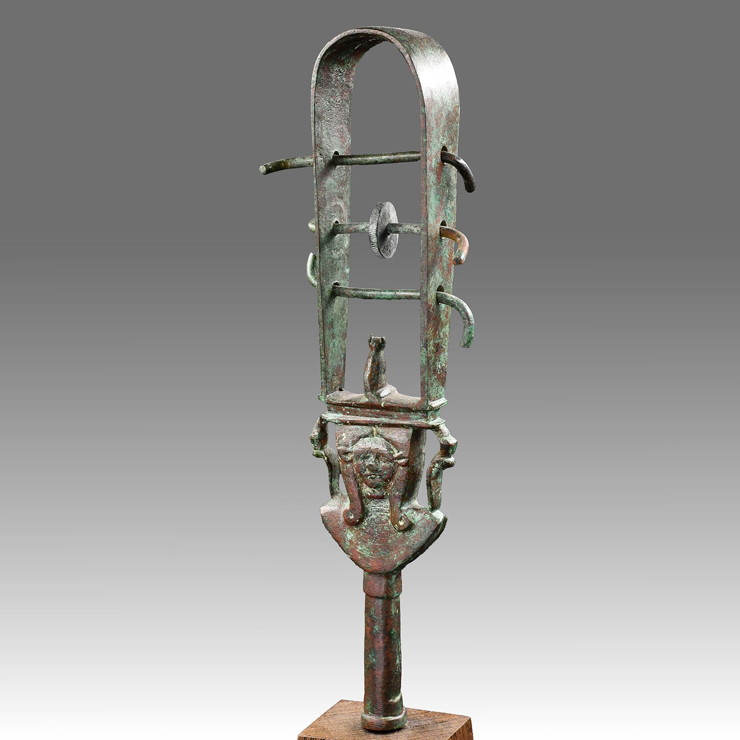 叉铃的整体形状类似于象征生命的安卡符号。圆柱形手柄末端为“蝙蝠徽章”形状,与音乐守护神哈索尔女神有关。在这里,她戴着卷曲的假发,长着牛耳朵,戴着一个大威塞克领。音盘呈钹状青铜片,在高拱门上的三个金属杆上移动,金属杆本身也会移动,相互发出嘎嘎声。在这个例子中,一个音盘仍然保留。哈索尔的肩膀上方是戴着上埃及和下埃及王冠的眼镜蛇。拱门底部是一只坐着的猫,可能代表太阳的联想,也可能代表女神被叉铃的声音抚慰的平和面。